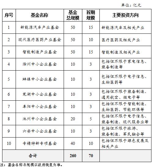 本次拟市场化遴选管理机构的专项基金共10支,包括:新能源汽车产业基金、现代医疗医药产业基金、智能制造产业基金、滁州中小企业基金、蚌埠中小企业基金、芜湖中小企业基金、阜阳中小企业基金、池州中小企业基金、六安中小企业基金、专精特新专项基金。各子基金按基金总规模一次性遴选管理机构,分四期设立。各专项基金规模及主要投资方向如下: